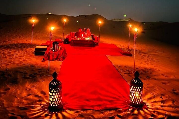 Savor a VIP desert experience with a private BBQ tent setup in the dunes. On Request- Belly Dance, Tanura and Fire Show.